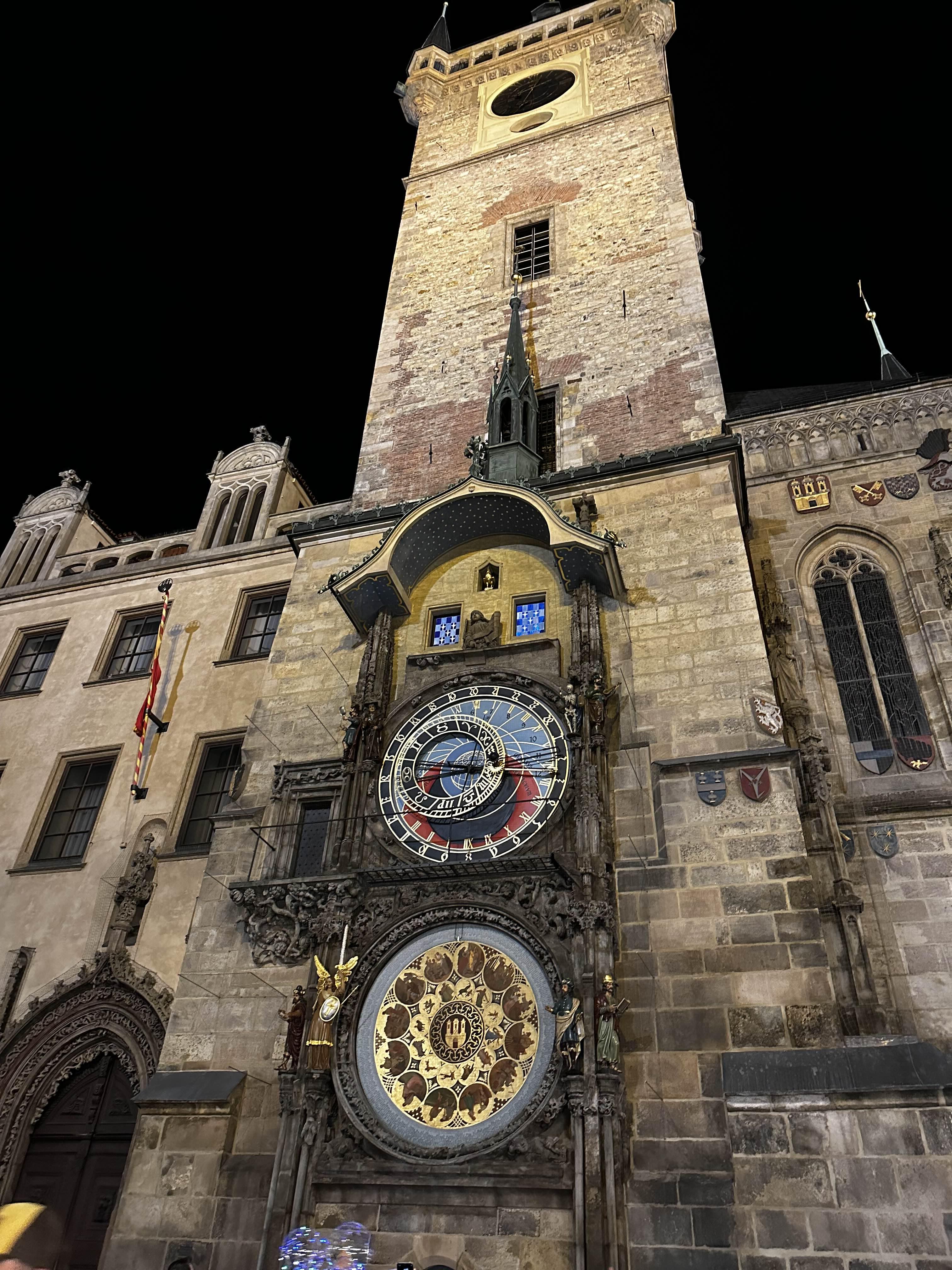 1410년 시계 장인인 미쿨라시(1350~1419)가 만들고, 프라하 대학의 학장으로 수학자이며 천문학자인 얀 신델(1375~1456)이 디자인했다. 15세기 당시 유럽인들은 천동설을 믿어 지구를 중심으로 달과 태양 행성들이 도는 형태다.
